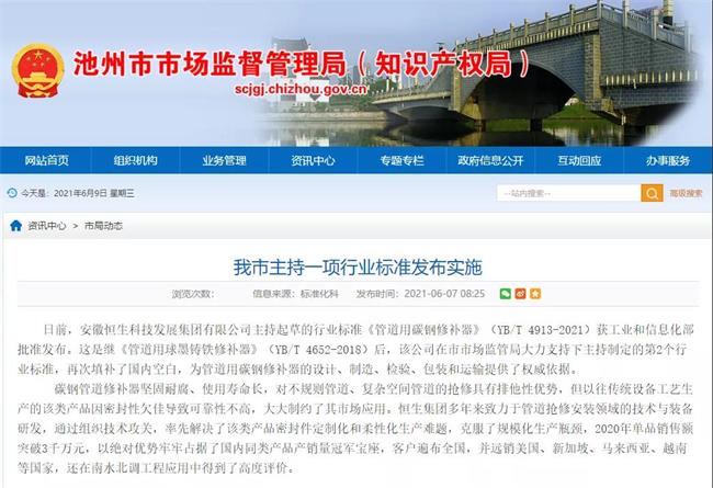 恒生集團(tuán)多年來(lái)致力于管道搶修安裝領(lǐng)域的技術(shù)與裝備研發(fā),并已發(fā)展成為集微電子、機(jī)械、化工及彈性體密封件制造等為一體,擁有多家控股子公司的多元化、現(xiàn)代化企業(yè)。恒生集團(tuán)是“安徽省高新技術(shù)企業(yè)”和“國(guó)家知識(shí)產(chǎn)權(quán)優(yōu)勢(shì)企業(yè)”,是多種材料標(biāo)準(zhǔn)的主要起草單位,2015年國(guó)家工信部批準(zhǔn)了由恒生集團(tuán)主持起草《管道用球墨鑄鐵修補(bǔ)器》的國(guó)家行業(yè)標(biāo)準(zhǔn),該標(biāo)準(zhǔn)將于2018年9月開始實(shí)施,這對(duì)引導(dǎo)國(guó)內(nèi)管道修補(bǔ)器行業(yè)的發(fā)展有著積極而深遠(yuǎn)的意義。